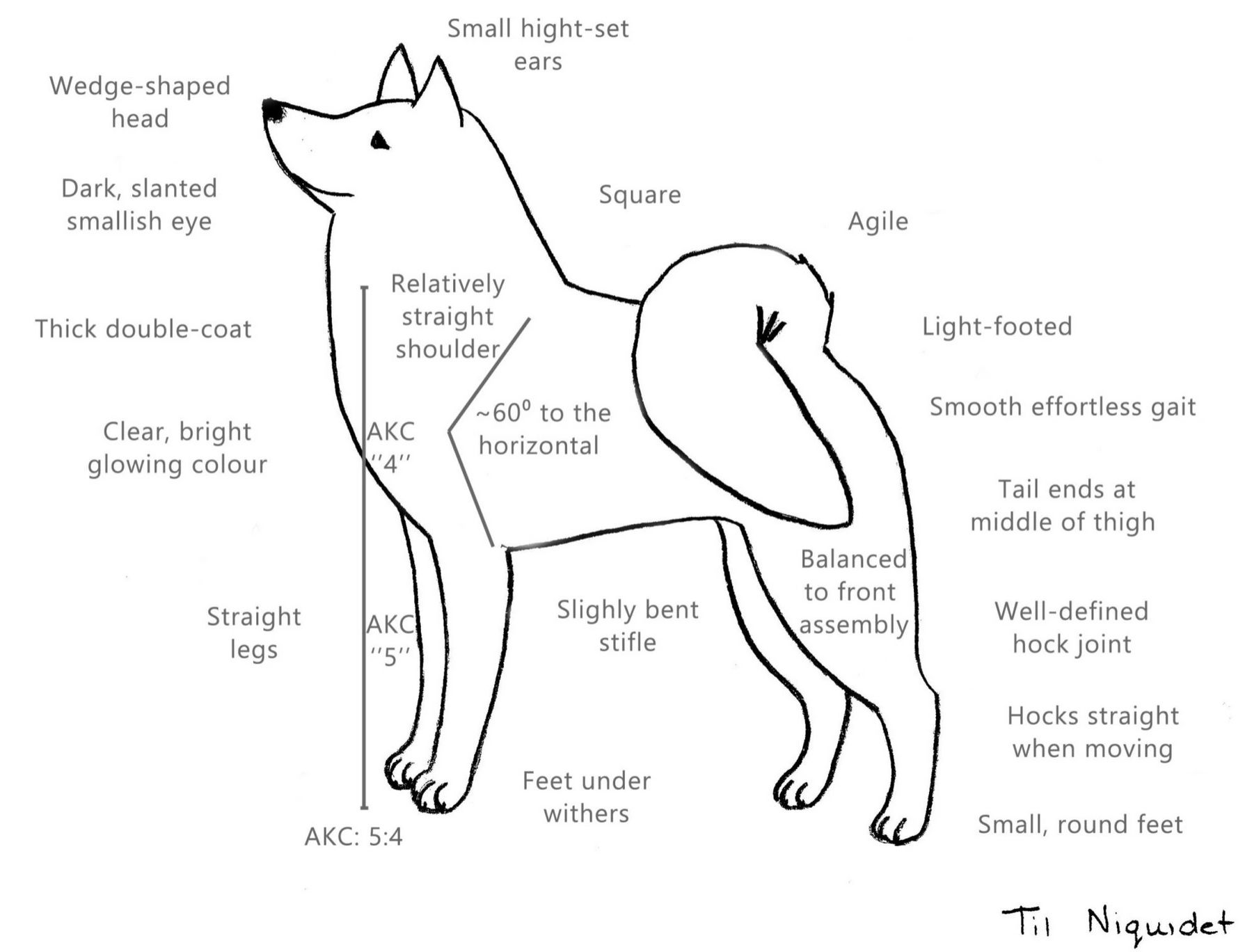 — we studied that in biology, how an animal is ideally built is dependent on the work that we want that animal to perform. The hunting Finnish Spitz is used on rocky and mossy ground, which he covers at a ”lope” or canter. He must not move forward too much with each step or he will stumble on the uneven forest floor. He must move effortlessly or he will tire too quickly.