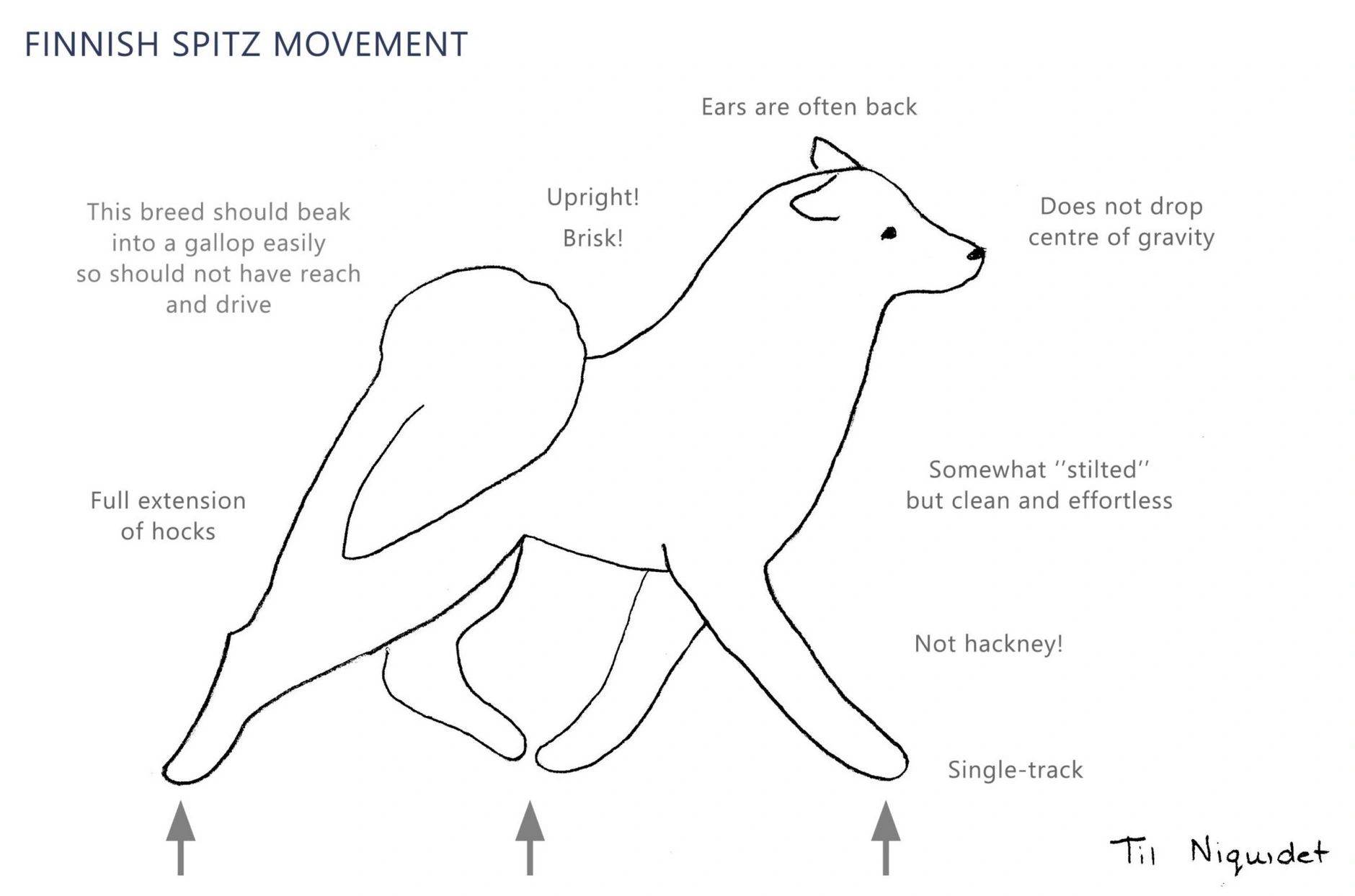 Moving the Finnish Spitz tends to ”single-track as speed increases”. This is where the physics is applied — in order to maintain a center of gravity, the dog should bring his feet closer under his body as he moves forward from a stand. As the speed increases the feet come closer and closer under his body.