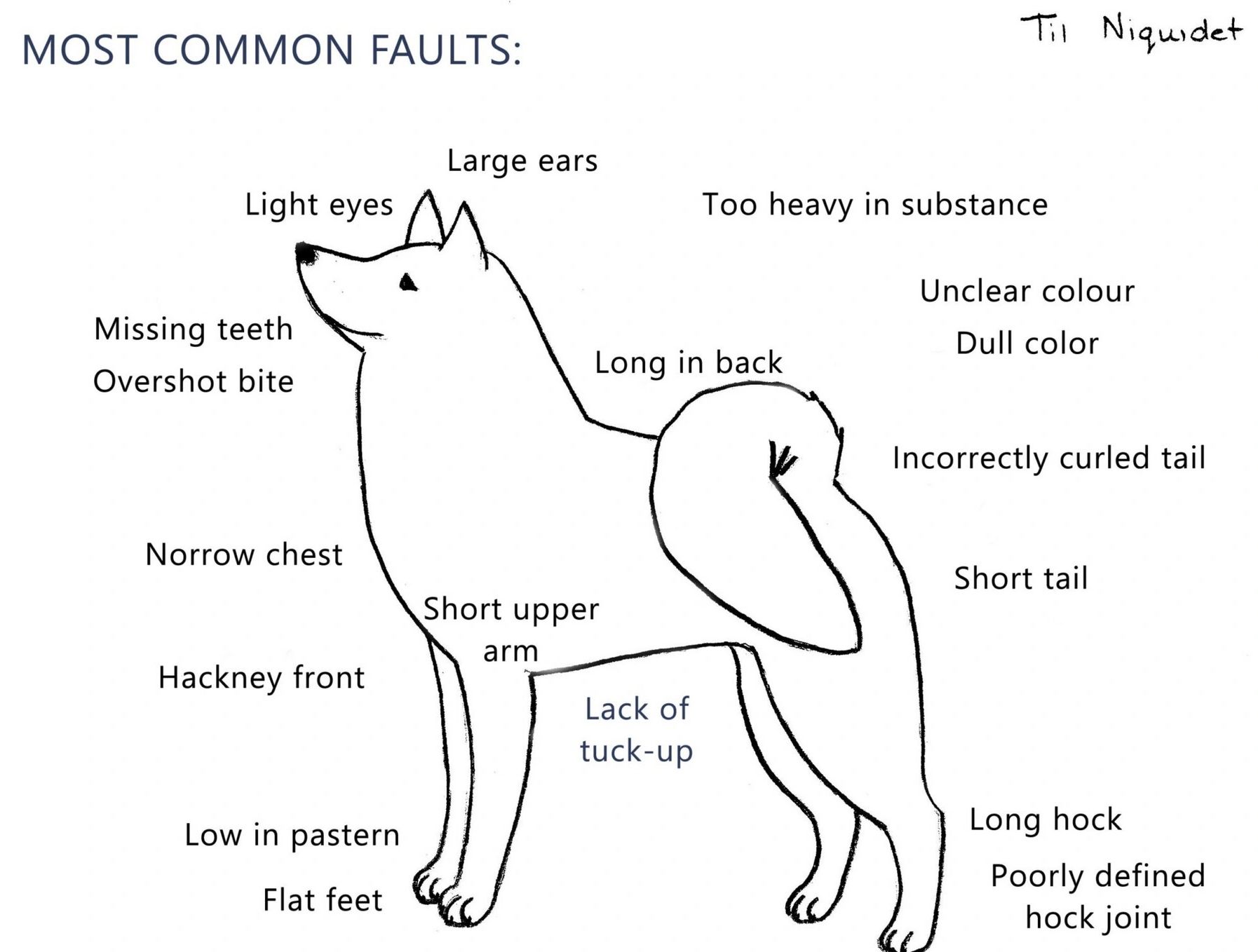 A common problem in Finnish Spitz is ”crabbing” or ”side-winding”. The dog tends to tracks so poorly that there are four separate tracks: the rear movement tending to creep up the side of the dog, and the dog appears to be moving side-ways. This is often cause by a poor-moving front being coupled with a stronger-reaching rear — the dog moves his front out of the way of the more efficient rear movement and so tends to move.